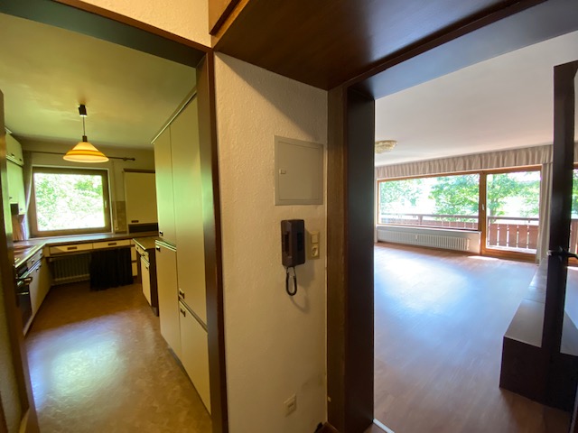 Am ruhigen Ortsrand und in leichter Hanglage an einem Anliegerweg ist das Mehrfamilienhaus mit 8 Wohnungen. Die Wohnung hat Ost- und Südbalkon (mit Markise) schöne Sicht über den Ort und hin zu den Bergen. In der Küche ist eine EBK, in den Schlafzimmern, Flur und Wohnzi. sind maßgefertigte Möbel eingebaut und bieten Stauraum. Im WZ und Flur ist Venylboden in den Schlafzi. ist Teppichboden verlegt. Das Bad hat ein Fenster und Wanne/DU/WB/WC und WM-Anschluß und ein sep. WC mit kl. Waschbecken. An allen Fenstern sind Rolläden. Zur geräumigen Wohnung gehört ein Keller und ein TG-Pl., ein Gemeinschafts Wasch-/Trockenraum steht zur Verfügung.
